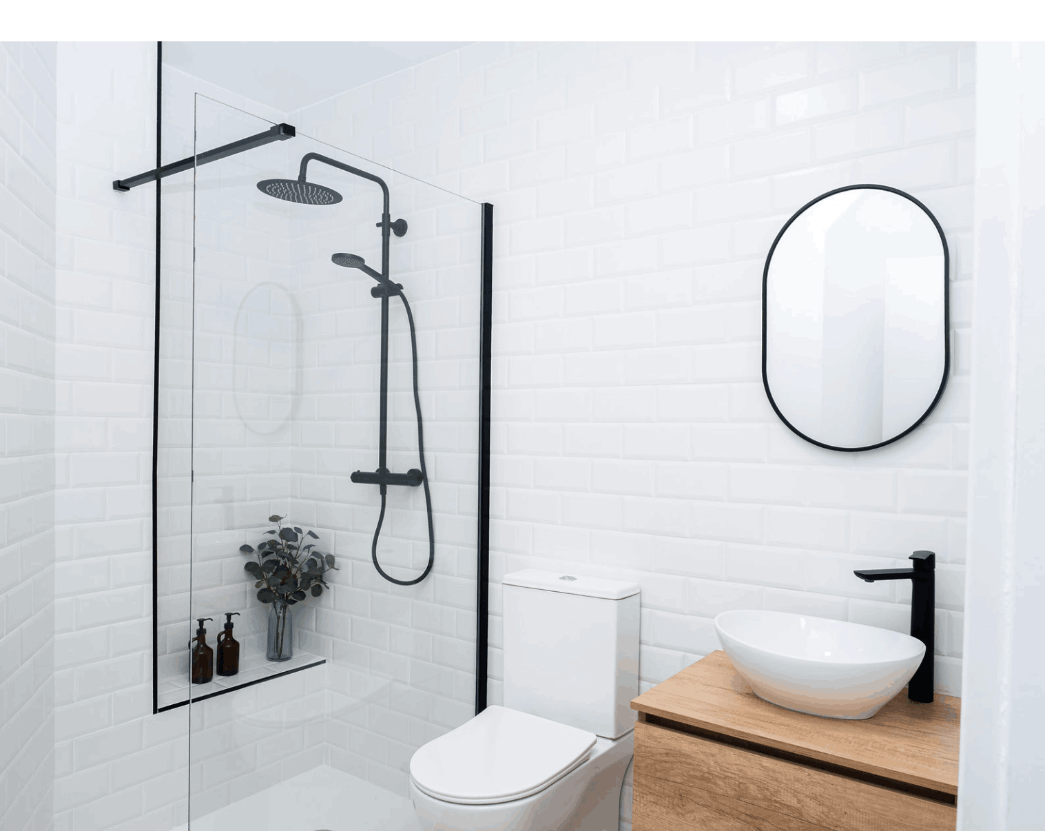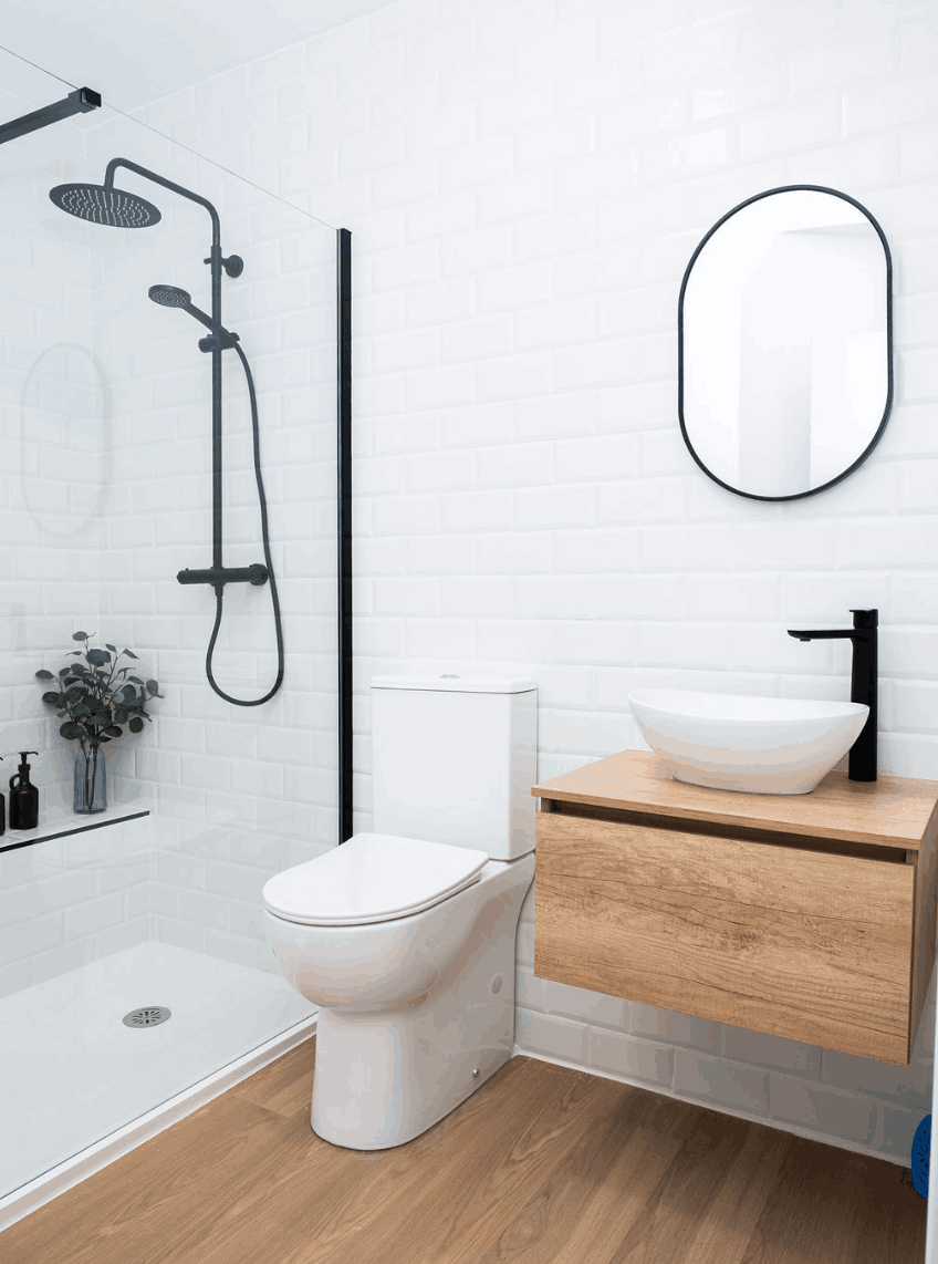 Baño de Autor (4,07 m²): Equipado con grifería negra de caño alto, espejo ovalado y mampara de inspiración industrial.
